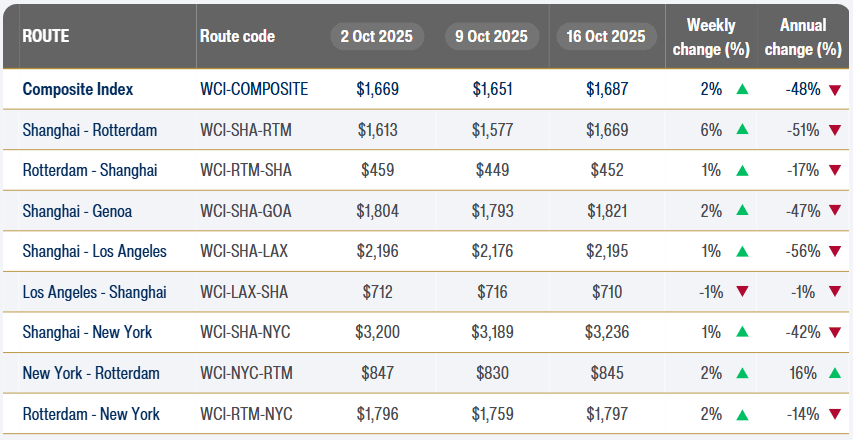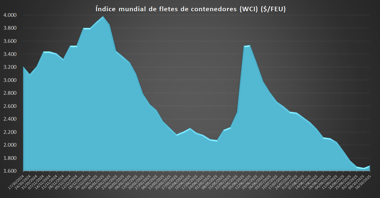 Los fletes cambian su tendencia 17/10/2025 ACE Con un valor de 1.310,32 USD/TEU, los fletes desde Shanghái (SCFI) suben hoy un 12,9% respecto a la semana anterior. El flete es un 36% más bajo que en el mismo periodo de 2024.