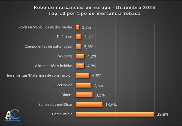 En diciembre de 2023 se han notificado en Europa un total de 179 robos de mercancías, un 57% menos que en el mismo periodo de 2022 (599 robos). Según las estadísticas elaboradas por ACE a partir de los datos extraídos de la Asociación para la Protección de Activos Transportados (TAPA), la mercancía más sustraída sigue siendo el combustible del vehículo (39,8%), seguido de los suministros metálicos / cobre (13,6%). Alemania continua encabezando el ranking de países con más delitos de robo de mercancía (39,5%), por delante de Reino Unido (14,1%), e Italia (13,0%). La mayoría de los robos (48,6%) se llevaron a cabo en las instalaciones de origen, ocupando el segundo lugar los robos en aparcamientos no seguros (25,1%)