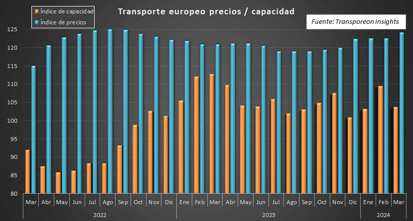 03/04/2024 ACE Según datos de la plataforma Transporeon Insights, los precios y la capacidad de carga del transporte de mercancías en Europa en el mes de marzo de 2024, han tenido la siguiente evolución: