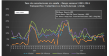 En los principales tráficos de transporte este-oeste: Transpacífico, Transatlántico y Asia-Norte de Europa y Mediterráneo, se ha anunciado la cancelación de 53 viajes entre la semana 27 (del 1 al 7 de julio) y la semana 31 (del 29 de julio al 4 de agosto), de un total de 665 salidas programadas, lo que representa una tasa de cancelación del 8%.[...]