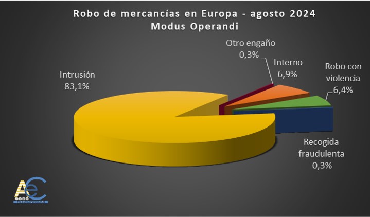 Según la estadística elaborada por ACE a partir de datos del mes de agosto, extraídos de la Asociación para la Protección de Activos Transportados (TAPA), la mercancía más sustraída sigue siendo el combustible del vehículo (56,9%), seguido de los suministros metálicos/cobre (25,0%). Alemania encabeza el ranking de países con más delitos de robo de mercancía (30,8%), seguido de Reino Unido (24,4%) y Francia (16,1%). La mayoría de los robos se llevaron a cabo en las instalaciones de origen (77,2%), ocupando el segundo lugar los aparcamientos no vigilados (20,2%). El 6,4% de los robos se realizó con violencia hacia el conductor.