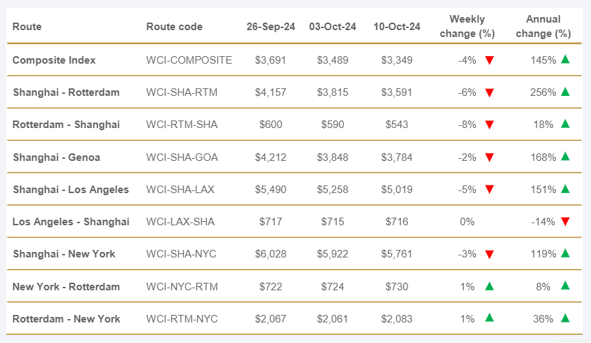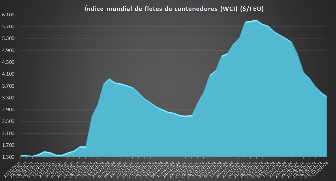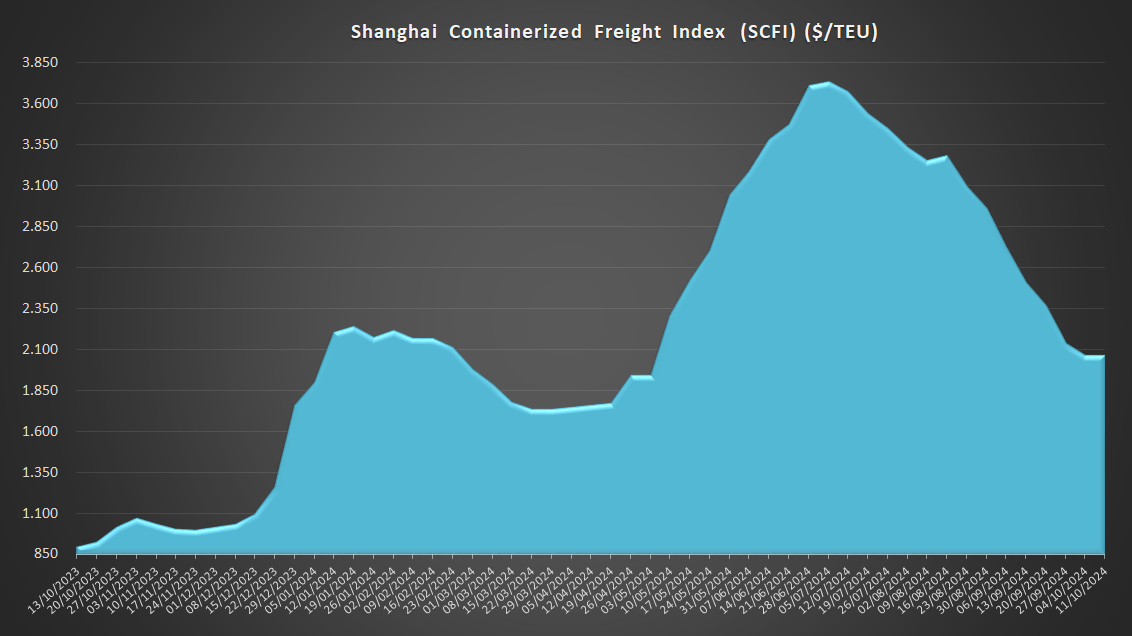 11/10/2024 ACE Con un valor de 2.062,57 USD/TEU, los fletes desde Shanghái (SCFI) reflejan hoy un descenso del -3,4% respecto a la semana anterior. El flete es un 131% superior al mismo periodo de 2023 y un 154% más alto que el promedio de 2019 (antes de la pandemia), situado en 811 USD.