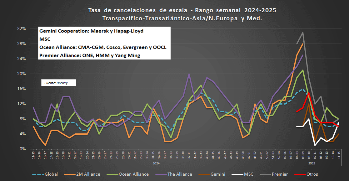 En las rutas comerciales clave Este-Oeste (Transpacífico, Transatlántico y Asia-Norte de Europa y Mediterráneo) se cancelaron 47 salidas entre las semanas 11 (10 de marzo-16 de marzo) y 15 (7 de abril-13 de abril), de un total de 715 salidas programadas, lo que representa una tasa de cancelación del 7%. [...]
