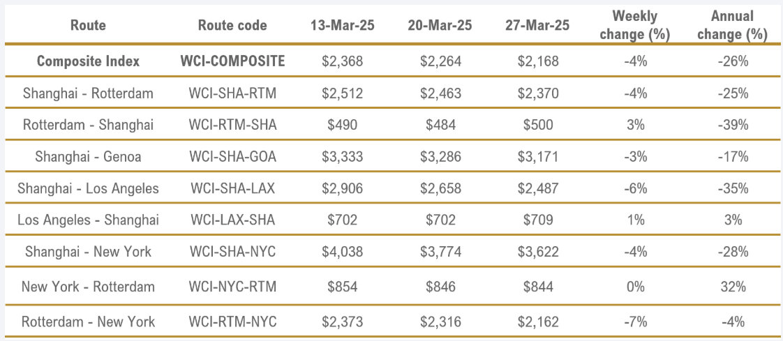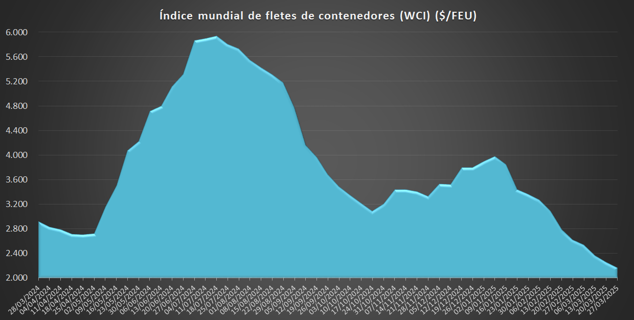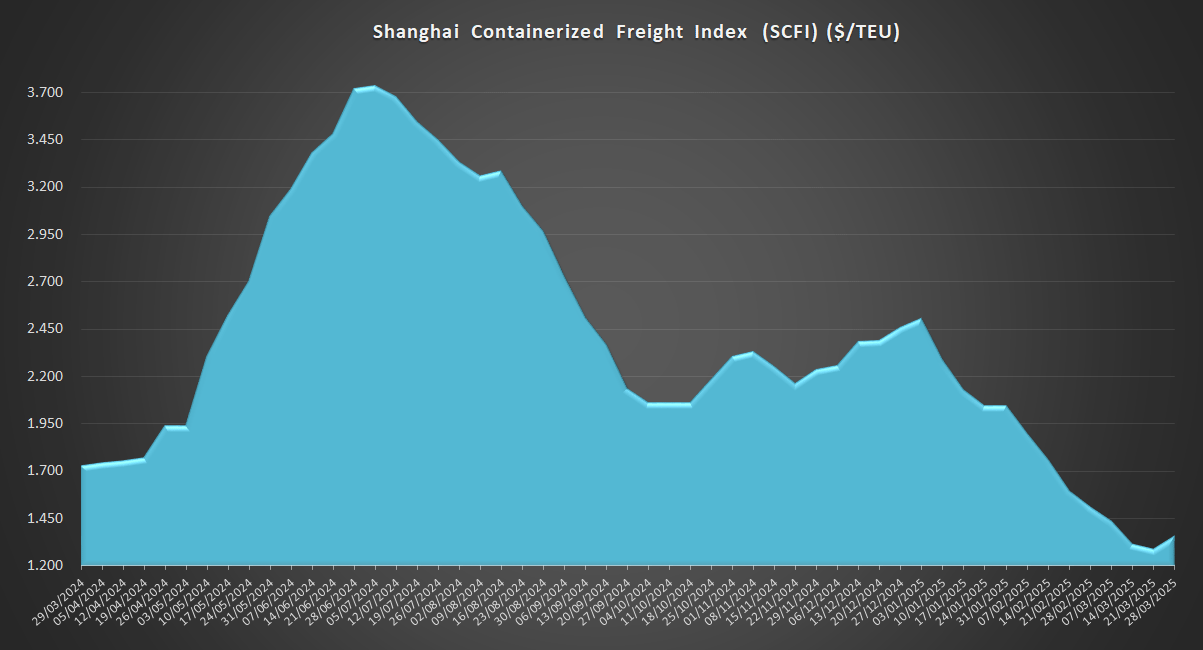 28/03/2025 ACE Con un valor de 1356,88 USD/TEU, los fletes desde Shanghái (SCFI suben hoy un 4,96% respecto a la semana anterior. El flete es un 22% más bajo que en el mismo periodo de 2024, aunque un 67% más alto que el promedio de 2019 (antes de la pandemia), situado en 811 USD.
