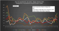 El exceso de oferta, la demanda débil y la creciente congestión están empujando a las navieras a intensificar los saltos de escala en octubre en un intento de estabilizar las tarifas. Las navieras han cancelado el 13% de sus salidas programadas (90 de 716) entre las semanas 40 (del 29 de septiembre al 5 de octubre) y la 44 (del 27 de octubre al 2 de noviembre). La mitad de las cancelaciones corresponden a la ruta Transpacífico Este (50%), seguida de la ruta Asia-Europa/Mediterráneo (37%) y la ruta Transatlántica Oeste (13%). [...]