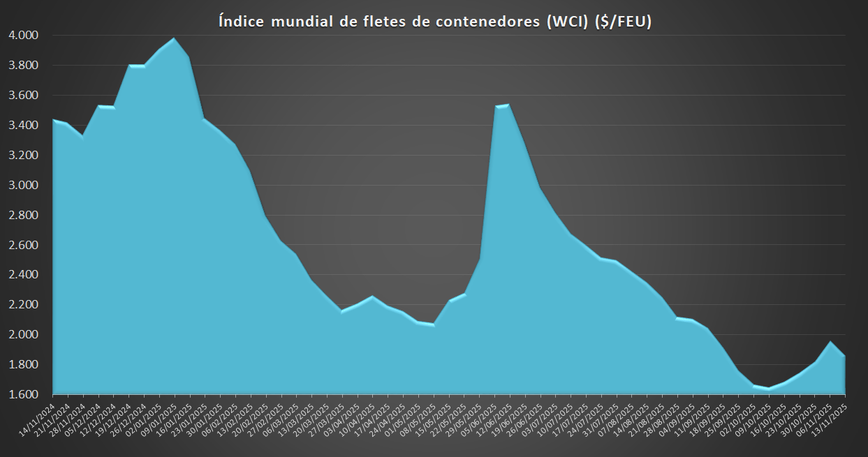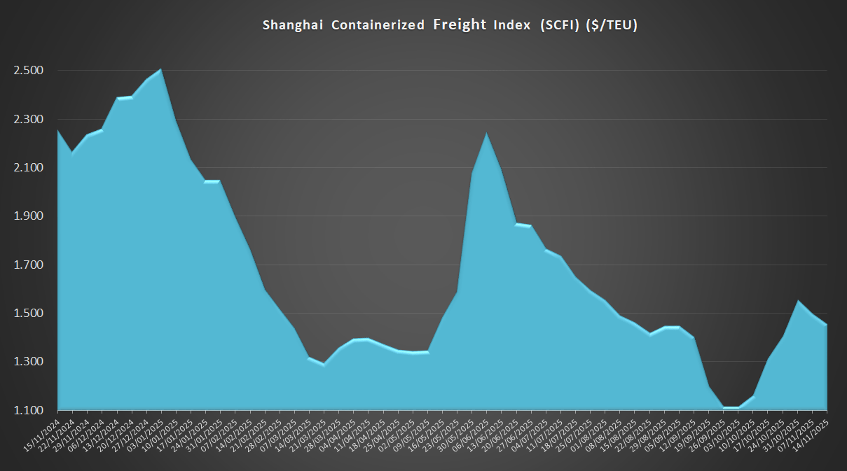 14/11/2025 ACE Con Con un valor de 1.451,38 USD/TEU, los fletes desde Shanghái (SCFI) bajan hoy un 2,9% respecto a la semana anterior. El flete es un 35% inferior al mismo periodo de 2024.
