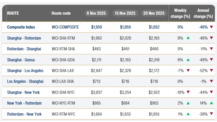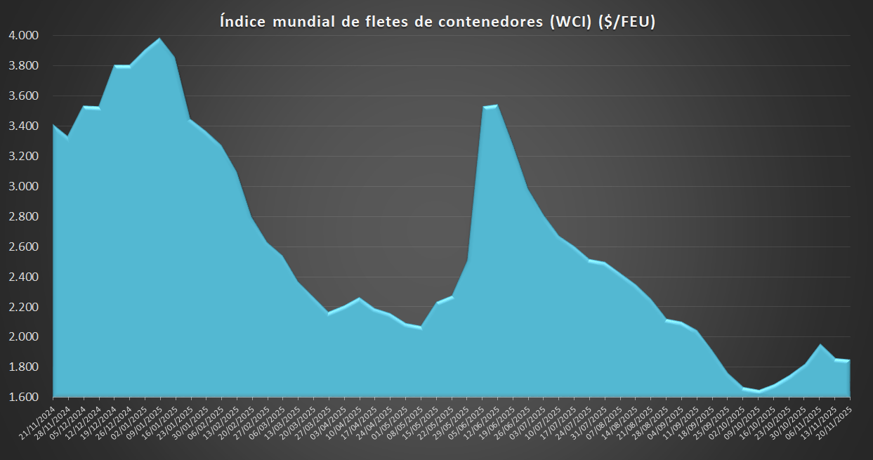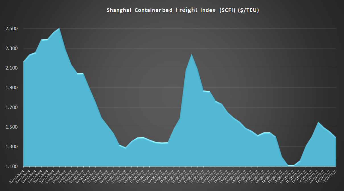 El SCFI continúa a la baja 21/11/2025 ACE Con un valor de 1.393,56 USD/TEU, los fletes desde Shanghái (SCFI) bajan hoy un 3,9% respecto a la semana anterior. El flete es un 36% inferior al mismo periodo de 2024.
