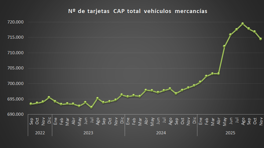 La información que aporta el MITMA sobre número de tarjetas CAP en vigor o, lo que es lo mismo, el número de conductores profesionales cualificados, muestra que a partir de agosto de este año, el número de tarjetas ha registrado una caída abrupta y no estacional, perdiendo aproximadamente 6.000 profesionales en solo tres meses.