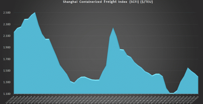21/11/2025 ACE Con un valor de 1.393,56 USD/TEU, los fletes desde Shanghái (SCFI) bajan hoy un 3,9% respecto a la semana anterior. El flete es un 36% inferior al mismo…