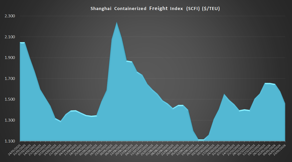 23/01/2026 ACE Con un valor de 1.457,86 USD/TEU, los fletes desde Shanghái (SCFI) bajan un 7,39% […]
