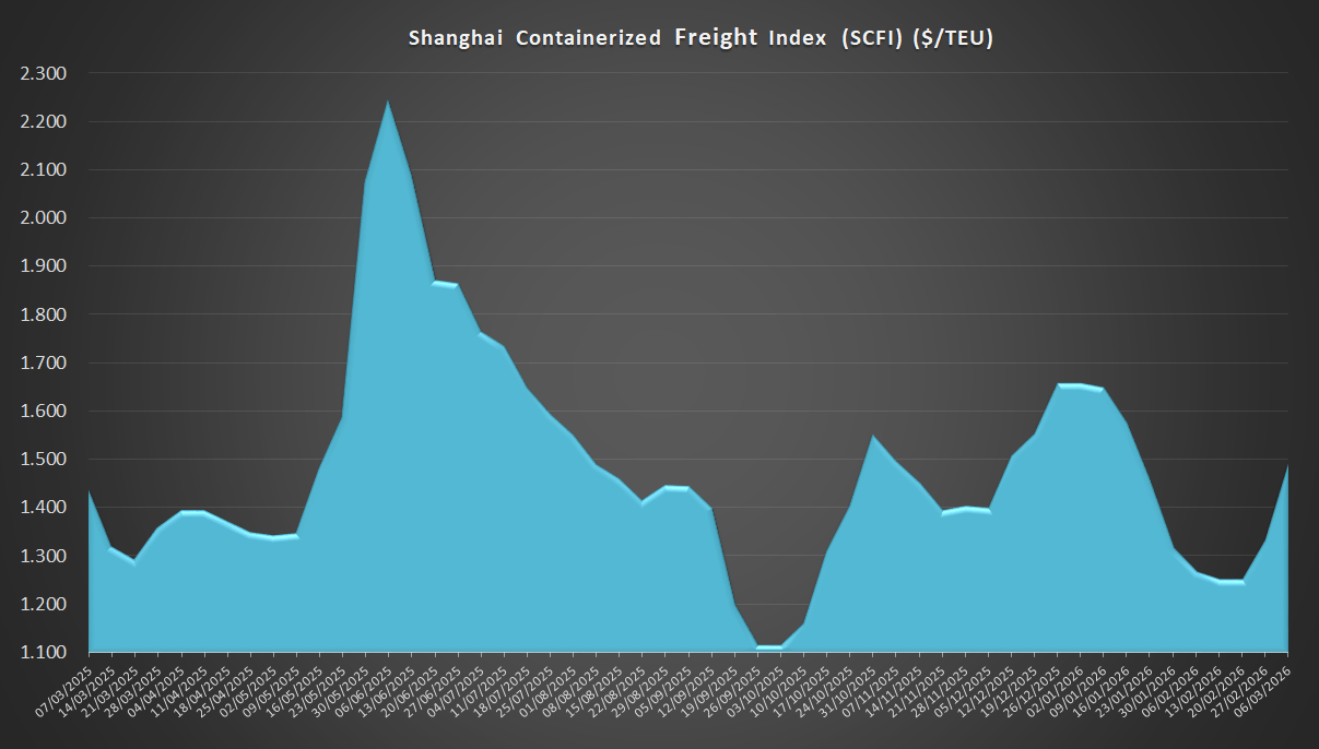 06/03/2026 ACE Con un valor de 1.489,19 USD/TEU, los fletes desde Shanghái (SCFI) suben un 11,71% […]