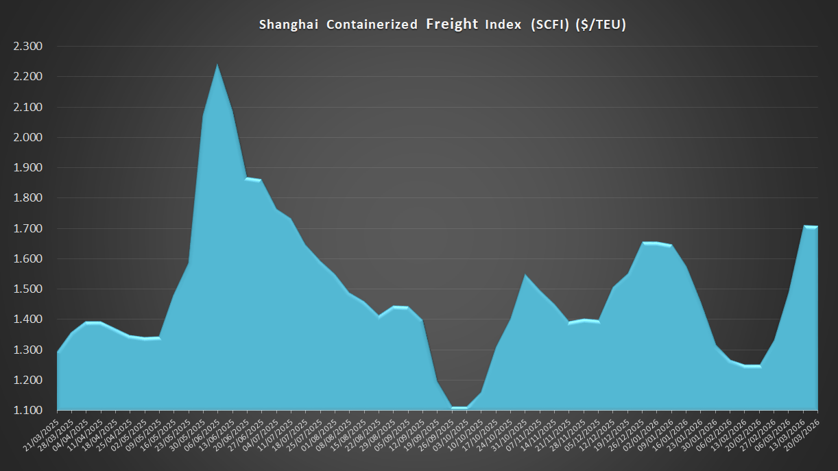 20/03/2026 ACE Con un valor de 1.706,95 USD/TEU, los fletes desde Shanghái (SCFI) bajan un 0,20% […]