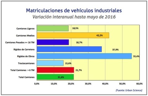 El acumulado de los cinco primeros meses de 2016 refleja un importante crecimiento del sector en el presente ejercicio, con un aumento de las unidades matriculadas del 21,6% con respecto al mismo periodo del ejercicio anterior.
