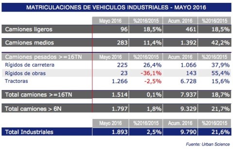 El mercado de vehículos industriales en mayo de 2016 ha registrado un aumento del 2,5% en comparación con el quinto mes de 2015. En total, se han matriculado en 1.893 vehículos, lo que supone 46 unidades más que en mayo del ejercicio anterior, según los datos de Aniacam.