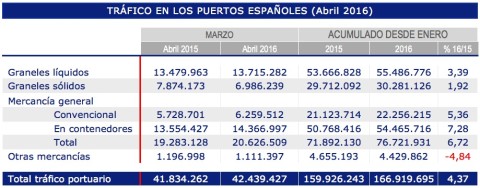 El tráfico de mercancías en los puertos españoles mantiene la tendencia alcista en el presente 2016, con un total de 162.489.833 tn manipuladas hasta abril, lo que supone un 4,65% más que las movidas en los cuatro primeros meses de 2015.