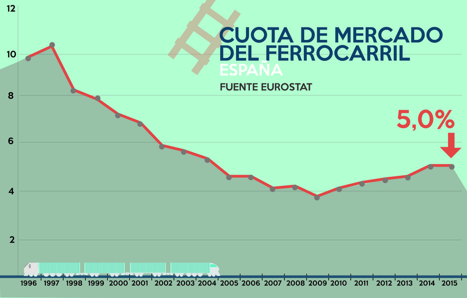 De esta forma, las estadísticas vuelven a demostrar cómo la recuperación de la cuota del ferrocarril entre 2009 y 2014, de casi 2,4 puntos porcentuales, se sustentó en el desplome por la crisis de los volúmenes de transporte por carretera en España, ganando cuota el tren gracias a las pérdidas de la carretera. Superados ya los peores momentos de la crisis y en cuanto la carretera ha vuelto a crecer a un ritmo razonable, el ferrocarril se ha demostrado incapaz de mantener el ritmo de incremento en su cuota de mercado.