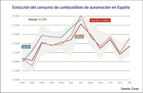 El consumo de carburantes de automoción en España ha descendido un 1,9% en el séptimo mes del año, hasta las 2.461.000 tn, con respecto a julio de 2015, lo que supone el segundo descenso del ejercicio junto al experimentado en enero.