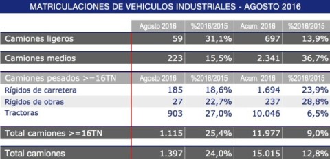 Por su parte, los medios han crecido un 15,5%, con 223 unidades, 30 más que en agosto de 2015. En este caso, Iveco, con un 54,26% de cuota, sigue dominando las matriculaciones.