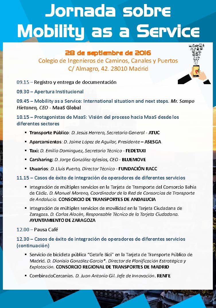 ITS España, organiza el próximo 28 de septiembre la «Jornada sobre Mobility as a Service» que tendrá lugar de 2016 en el Colegio de Ingenieros de Caminos, Canales y Puertos de Madrid.