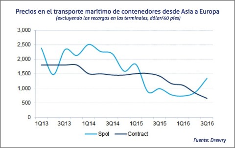 En concreto, el mercado spot en el comercio entre Asia y Europa se mantiene al alza desde principios del ejercicio y, en el tercer trimestre de 2016, sus precios son un 35% superiores a los del mismo periodo del 2015. Por contra, los precios pactados en contratos se mantienen a la baja desde el segundo trimestre de 2015.