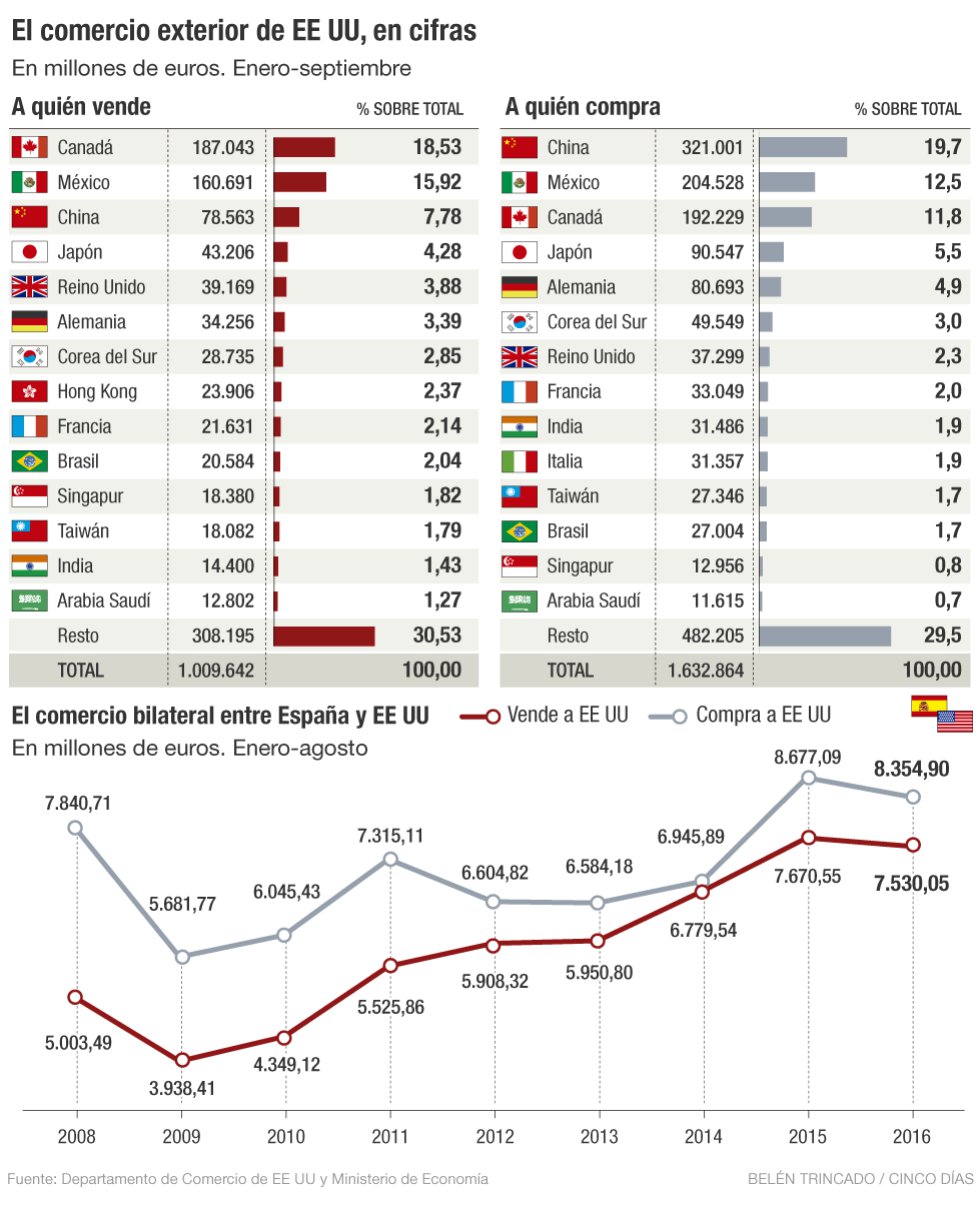 España será uno de los países menos afectados si finalmente el presidente electo de EE UU opta por la imposición de aranceles a las importaciones. Estados Unidos apenas absorbe el 4,4% de las exportaciones españolas y es el responsable del 4,6% de las importaciones españolas. En cuanto a la inversión, las compañías estadounidenses invirtieron 1.581 millones de euros en 2015, un 7,3% del total. Unos porcentajes muy pobres que aíslan a España del choque que ha supuesto que Donald Trump haya ganado las elecciones en EE UU y que tenga pensado (otra cosa es que lo lleve a cabo) aplicar sus postulados proteccionistas. Estos tendrán reflejo en la imposición de aranceles abusivos a las exportaciones de Latinoamérica y Asia, a cuyas fábricas se ha trasladado en las dos últimas décadas gran parte del tejido industrial norteamericano en busca de costes más bajos. El objetivo de Trump es recuperarlas.