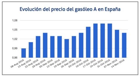 El precio del litro de gasóleo mantiene la tendencia a la baja iniciada a primeros de noviembre de 2016. En concreto, se ha situado en los 1,041 euros en la segunda semana del mes frente a los 1,061 euros de la primera, lo que supone un retroceso del 1,88%.