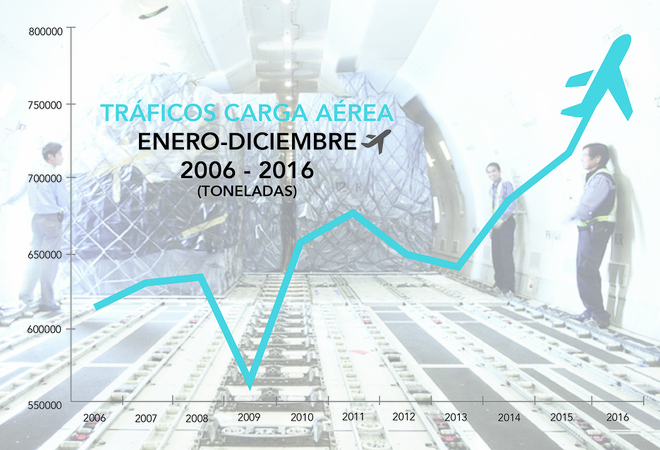 AENA hizo ayer públicos los datos de tráfico de su red de aeropuertos en 2016 que, tal y como estaba previsto, arrojan un balance espectacular en lo que respecta al transporte aéreo de mercancías.