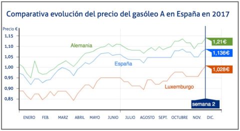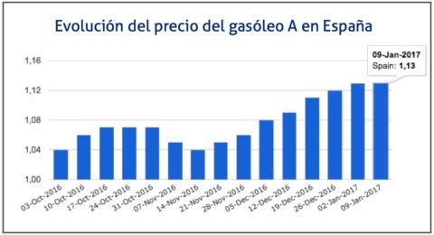 El precio del litro de gasóleo ha alcanzado los 1,136 euros en la semana entre el 3 y el 9 de enero, lo que supone un incremento del 0,79% respecto a los 1,127 euros del registro anterior. En total, acumula una subida del 9% desde mediados de noviembre de 2016 y de un 18% respecto a la misma semana del ejercicio anterior.