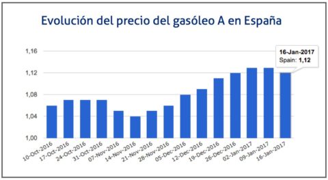 Tras una escalada que ha durado varias semanas, el precio del litro de gasóleo ha alcanzado los 1,129 euros en la semana entre el 10 y el 16 de enero, lo que supone una caída del 0,61% respecto a los 1,136 euros del registro anterior. Sin embargo, pese a esta disminución, acumula una subida del 15% respecto al mismo periodo del año pasado.