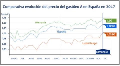En cuanto a los datos de otros países europeos, el precio más bajo en el gasóleo es en esta semana el de Luxemburgo, con 1,028 euros por litro, mientras que Suecia es el país con el precio más elevado, con 1,472 euros.