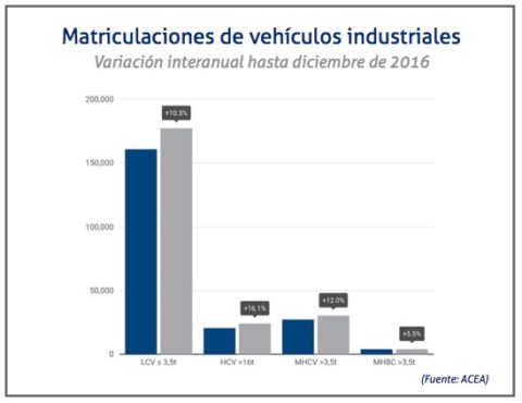 Por lo que respecta a las matriculaciones de vehículos industriales de más de 16 tn, han subido un 12,3% en 2016, llegando a las 292.170 unidades. Italia vuelve a mostrar el mayor porcentaje de crecimiento, que asciende al 52,9%, seguido de Francia, con un 12,9%.