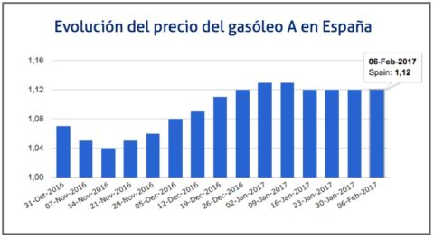 El precio del litro de gasóleo ha repuntado ligeramente en la semana entre el 31 de enero y el 6 de febrero, alcanzando los 1,124 euros, frente a los 1,122 euros del registro anterior, lo que supone un incremento del 0,17%.