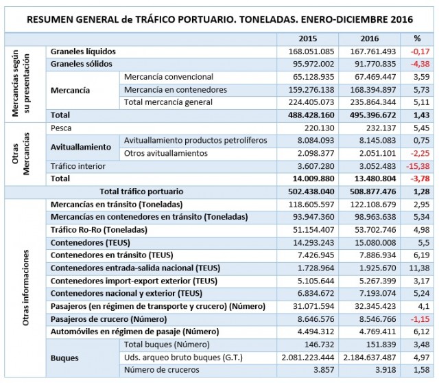 Durante 2016, según las estadísticas publicadas por Puertos del Estado, en el conjunto de las 28 Autoridades Portuarias de titularidad estatal se movieron 495,4 millones de toneladas de mercancías (Mt), con un crecimiento respecto de 2015 de solo un 1,4%, sensiblemente menor que los registrados en 2015 (+4,3%) y 2014 (+5,1%).