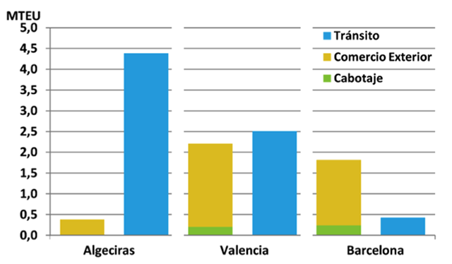El pasado año, en los puertos españoles se movieron 168,4 Mt de carga en contenedores (+5,7%), de ellas 135,1 Mt en Algeciras, Valencia y Barcelona, que suponen el 80,2% del total en tonelaje. Medidos en TEU, este porcentaje fue del 77,7% totalizando Algeciras 4,8 MTEU (+5,4%), Valencia 4,7 MTEU (2,3%) y Barcelona 2,2 MTEU (+14,1%). Del total de 15,1 MTEU movidos en 2016, 7,9 MTEU correspondieron a contenedores en régimen de tránsito internacional (+6,2%); 5,3 MTEU a contenedores movidos en el comercio exterior (+3,2%) y 1,9 MTEU al cabotaje (con un sensible aumento del 11,4%). Algeciras destaca en el movimiento de contenedores en tránsito, que suponen el 97,0% de su tráfico de contenedores y el 55,6% de los contenedores en tránsito movidos en los puertos españoles en 2016.
