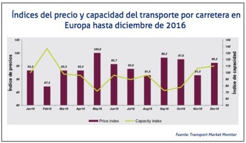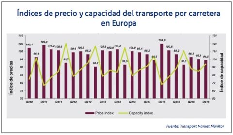 La 30ª Edición del ‘Transport Market Monitor‘, elaborado por Capgemini Consulting con la colaboración de Transporeon, muestra que los precios del transporte han disminuido un 0,6% en el último trimestre de 2016 respecto a los resultados del trimestre anterior, con un índice del 94,5 frente a un 95,1.