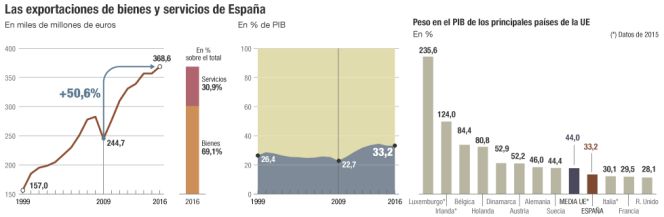 En ese mismo período, el PIB no empezó a crecer hasta 2014 y eso provocó que las exportaciones crecieran más rápido que la economía española y que el peso del sector exterior se incrementara sustancialmente. En 2009, las exportaciones suponían el 22,7% del PIB, mientras que en 2016, si se tiene en cuenta la cifra de PIB que maneja el Ejecutivo dentro del Plan Presupuestario remitido a Bruselas, el porcentaje creció hasta el 33,2%. Un porcentaje superior al registrado por Italia (30,1%), Francia (29,5%) o Reino Unido (28,1%), pero lejos del 46% de Alemania.