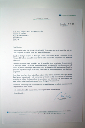 “Recomiendo encarecidamente a España que adopte rápidamente todas las medidas pendientes, en particular la aprobación del Real Decreto Ley por el Parlamento español”, dice Bulc en su misiva, urgiendo a que dicha aprobación sea comunicada a la Comisión en cuanto se produzca pues es de vital importancia “a la luz de las multas diarias vinculadas al incumplimiento de la sentencia del Tribunal de Justicia de la Unión”, multas que de acuerdo con la carta la comisaria considera seguras pese a estar pendientes de la segunda sentencia del Tribunal.