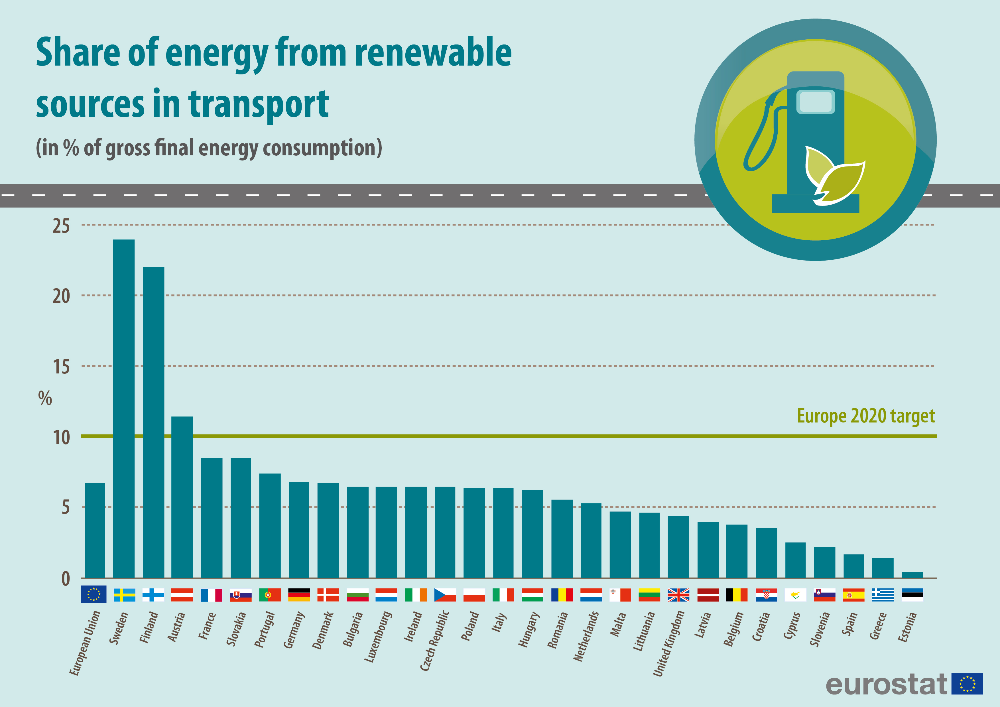 Con una media del 16,7% de la energía procedente de fuentes renovables en su consumo final bruto de energía, la Unión Europea se acerca a su objetivo global de 2020 de alcanzar un 20%. Sin embargo, la Estrategia Europa 2020 también tiene un subindicador específico sobre la proporción de combustibles para el transporte procedentes de fuentes renovables. El objetivo de este subindicador es el 10%. Los cálculos se realizan de conformidad con la Directiva 2009/28/CE relativa al fomento del uso de energía procedente de fuentes renovables.
