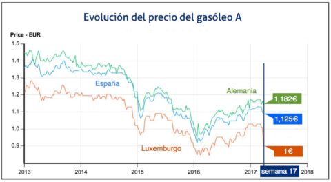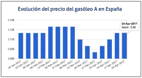El precio del litro de gasóleo ha alcanzado los 1,125 euros en la semana entre el 18 y el 24 de abril de 2017, lo que supone un incremento del 2,6% respecto a los resultados de principios de mes, ya que la Comisión Europea no había ofrecido datos nuevos desde el 10 de abril.