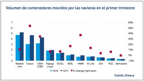 La mayoría de operadores de contenedores han registrado pérdidas en los tres primeros meses de 2017, pero según recoge la consultora Drewry, la industria podría alcanzar unos 1.500 millones de dólares (1.341 millones de euros) de beneficio operativo a lo largo del año, lo que permitiría compensar las grandes pérdidas de 2016.