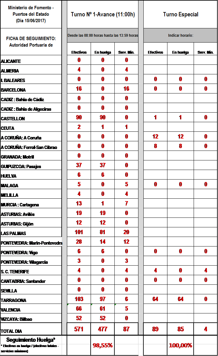 De acuerdo con la información recibida de las Autoridades Portuarias el seguimiento de la huelga está en torno al98,5% en el conjunto del sistema portuario.