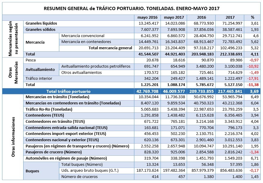 Según las estadísticas publicadas por Puertos del Estado, en los primeros cinco meses de 2017, en el conjunto de las 28 Autoridades Portuarias de titularidad estatal se movieron 217,4 millones de toneladas de mercancías, con un crecimiento respecto de 2016 de un 3,7%. La mercancía general, que aumentó un 5,32% hasta situarse por encima de los 102,5 millones de toneladas, sigue tirando del tráfico de mercancías y también los graneles líquidos, con un incremento del 3,6% en este periodo, y en menor medida los graneles sólidos, con un incremento del 1,9%.