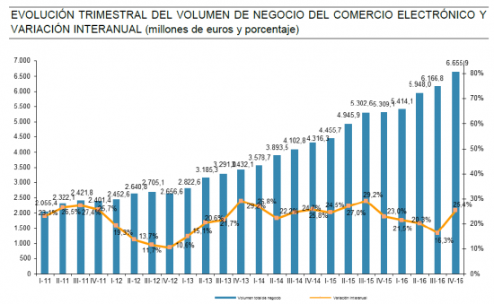 La facturación del comercio electrónico en España ha aumentado en el cuarto trimestre de 2016 un 25,4% interanual hasta alcanzar los 6.656 millones de euros, según los últimos datos de comercio electrónico disponibles en el portal CNMCData. Así, la facturación total del año 2016 ha alcanzado los 24.185 millones de euros, un 20,8% más que el 2015.
