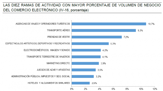 Los ingresos de comercio electrónico dentro de España (compras hechas en España a webs españolas) han aumentado un 22,4% interanual hasta los 2.688,4 millones de euros. El sector turístico supone el 27,5% de la facturación dentro de España, seguido de los espectáculos artísticos, deportivos y recreativos (10,1%), los electrodomésticos, imagen y sonido (8,2%) y la administración pública, impuestos y seguridad social (7,1%).
