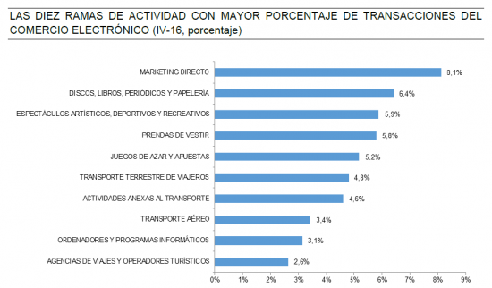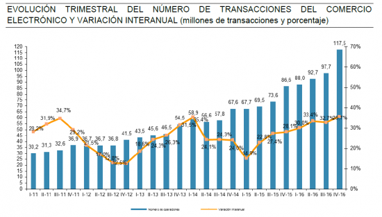 Si nos fijamos en el número de transacciones, en el cuarto trimestre de 2016 se han registrado más de 117 millones de transacciones, un 35,7% más. El marketing directo y los discos, libros, periódicos y papelería lideran el ranking por compraventas (8,1% y 6,4% respectivamente).