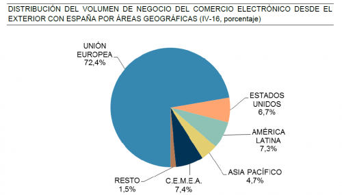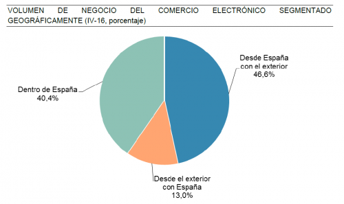 En cuanto a la segmentación geográfica, las webs de comercio electrónico en España se han llevado el 53,4% de los ingresos en el cuarto trimestre de 2016. El 46,6% restante se corresponde con compras con origen en España hechas a webs de comercio electrónico en el exterior.