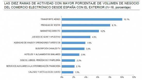 Las ramas de actividad con mayor volumen de negocio desde España hacia el exterior son el trasporte aéreo (un 10,1%), las prendas de vestir (8,1%) y el marketing directo (un 6,2%).