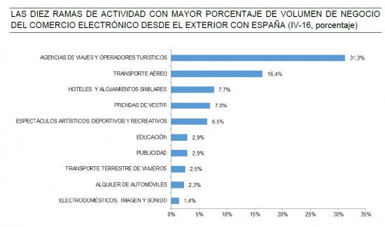 Asimismo, las áreas de actividad relacionadas con el sector turístico (que agrupa las agencias de viajes, transporte aéreo, transporte terrestre, alquiler de automóviles y los hoteles) acaparan el 60,2% de las compras que desde el extranjero se hacen en webs de comercio electrónico españolas.