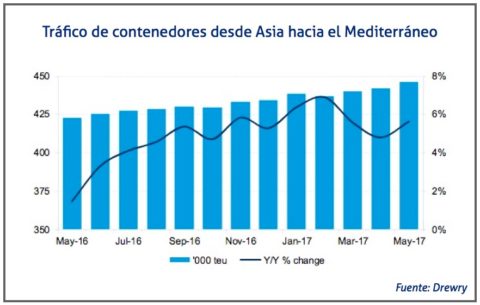 El comercio desde Asia hacia el Mediterráneo está avanzando mucho más de lo esperado, registrando un incremento del 5,6% en el primer trimestre de 2017frente al 3% previsto inicialmente por la consultora Drewry. Los datos de abril y mayo han contribuido, además, a un crecimiento del 6,9% en el acumulado anual, hasta los 2,3 millones de TEUs.
