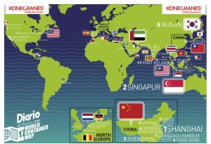 La fábrica del mundo es un año más la dominadora incontestable del tráficos portuario mundial de contenedores. No puede ser de otra forma pues a los factores económicos hay que añadir los factores geográficos para conformar un mapa mundial del tráfico portuario contenerizado con Asia como líder indiscutible. Así se pone de manifiesto en el “World Container Map 2017”, editado un año más por Grupo Diario y en el que se evidencia cómo esta posición de liderazgo sigue reforzándose ejercicio tras ejercicio.